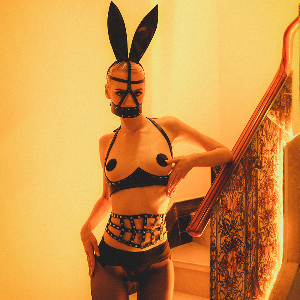 - Add blindfolds, gag panels, or animal ears (like our Bunny BDSM Mask).